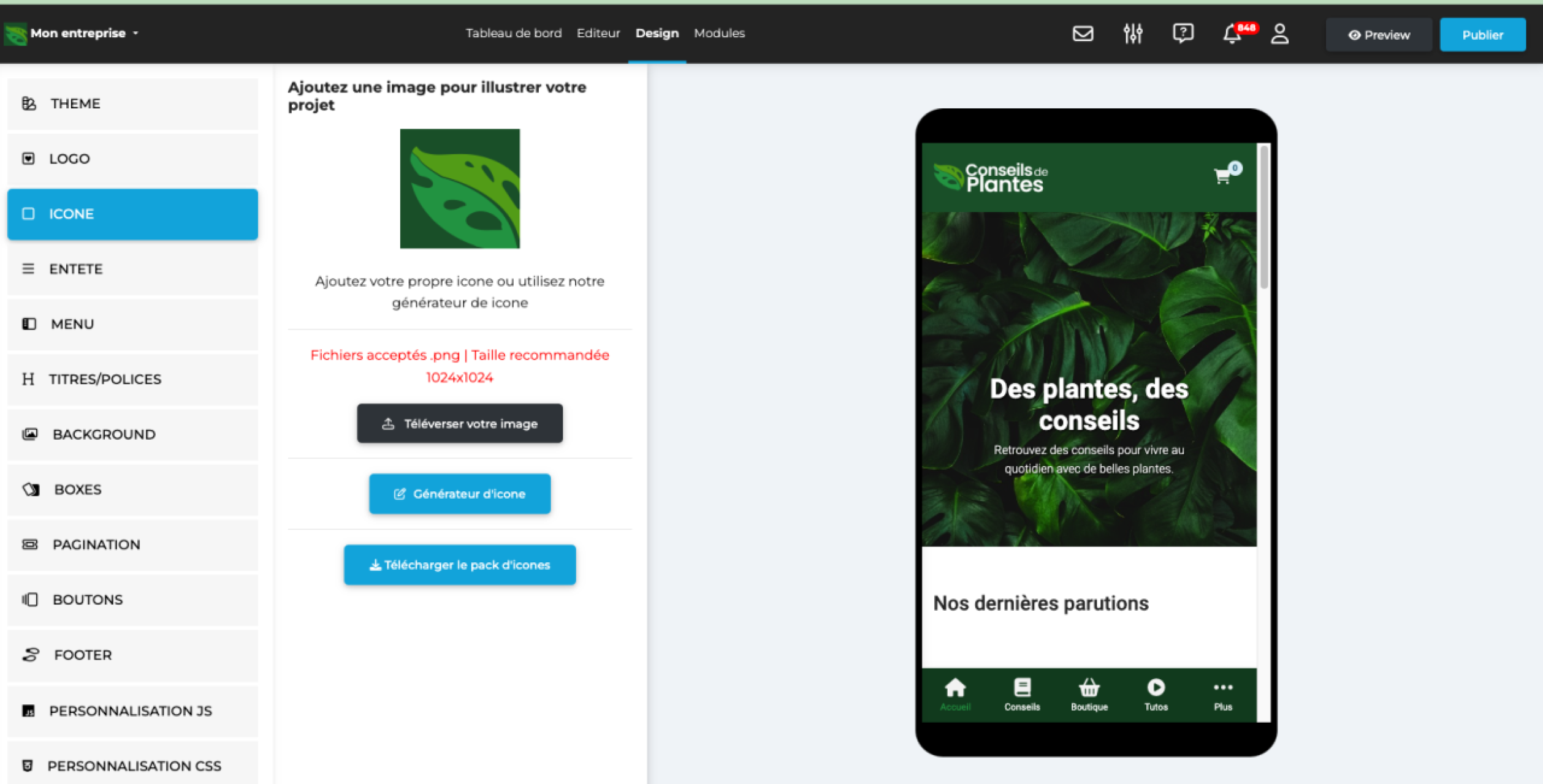 Pour configurer l'icône de votre application qui apparaîtra sur la page d'accueil du téléphone :