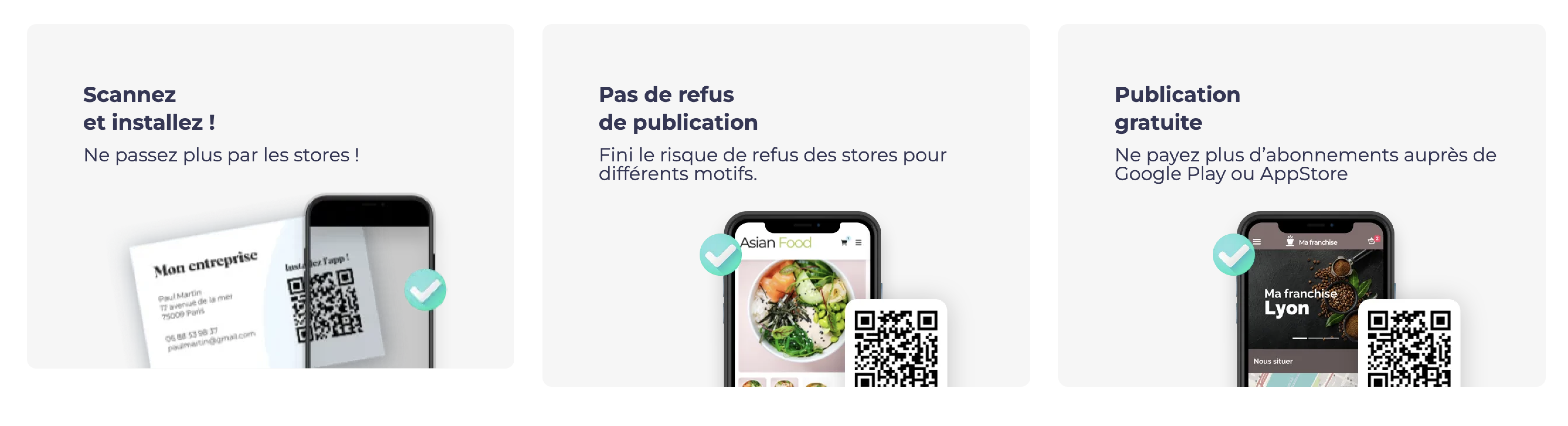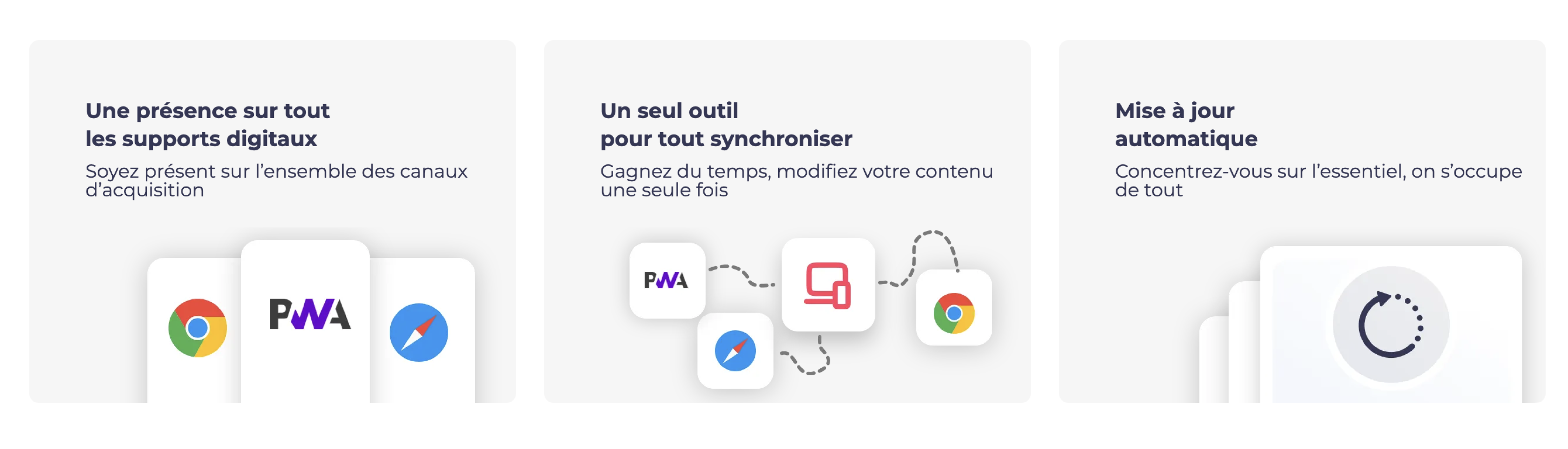 Il s'agit de la même offre que celle du site internet, sauf qu'il y a une option pour installer le site sur le smartphone des utilisateurs. Une Progressive Web App (PWA) est un super site internet qui peut s’installer sur son smartphone ou ordinateur via une simple URL ou un QR code. Elle utilise des fonctionnalités puissantes qui s’apparente à celle d’une application native.